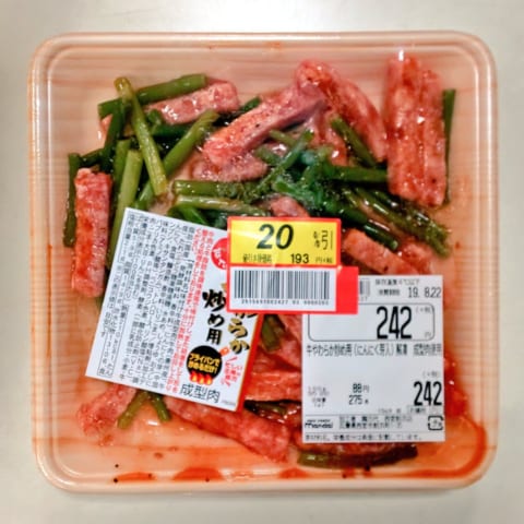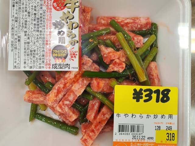 スーパーでよく見かける細長くカットされた成型肉とにんにくの芽が入ったヤツ好き