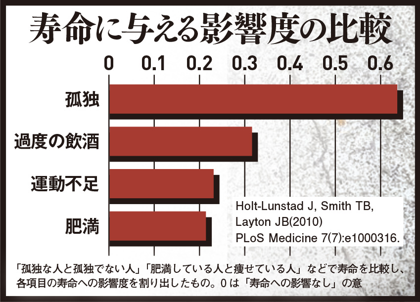 アメリカ・ブリガムヤング大学のジュリアン・ホルトランスタッド教授は、2010年に「社会的なつながりを持つ人は、持たない人と比べて早期死亡リスクが50%低下する」という研究結果を発表しました。つまり、孤独が死亡率を2倍にするというわけです。