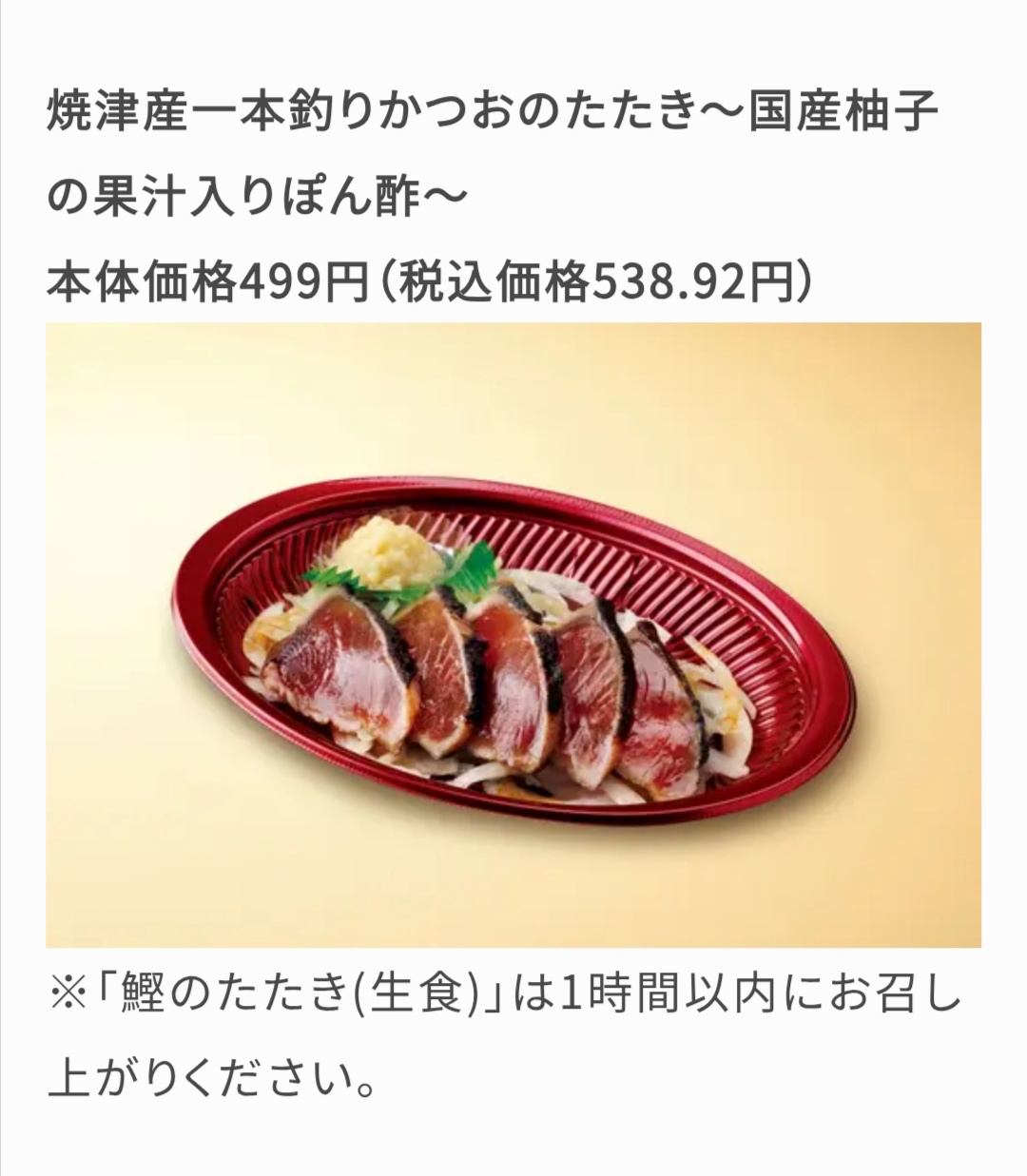 一般的な持ち帰り専のお弁当屋の弁当でわざわざ鰹のタタキ食おうと思えないなあ…