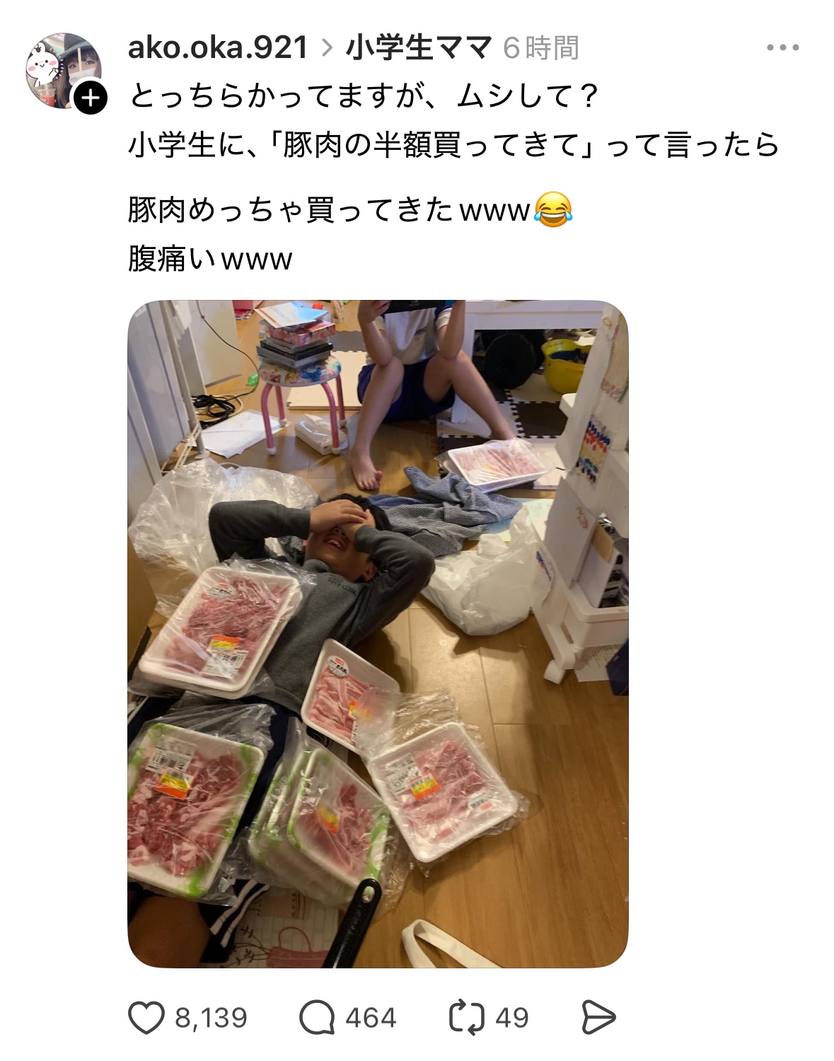 マッマ「半額の豚肉買ってきて」息子(小6)「おかのした」→