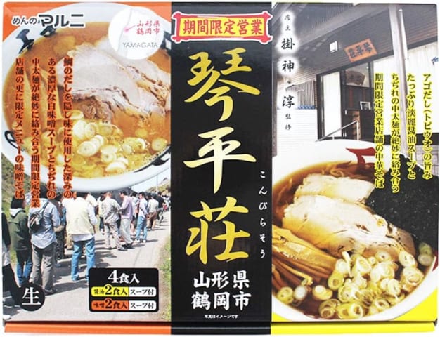 マルニ食品 めんのマルニ 鶴岡琴平荘 監修 中華そば 醤油味2食 味噌味2食 4食×2箱 山形県鶴岡市の日本海に面した期間限定営業のラーメン店