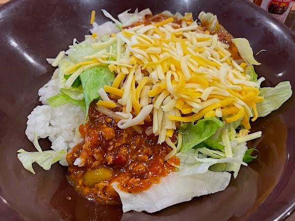 タコスの具材をご飯に載せただけや