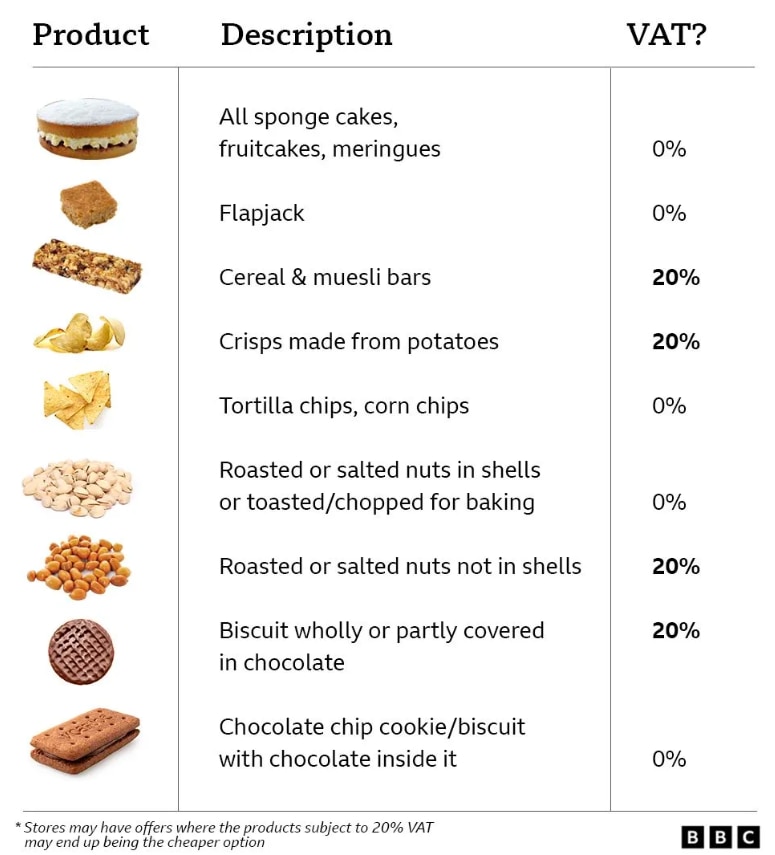 チョコレートを挟んだクッキーは非課税。チョコレートがかかったビスケットは課税。