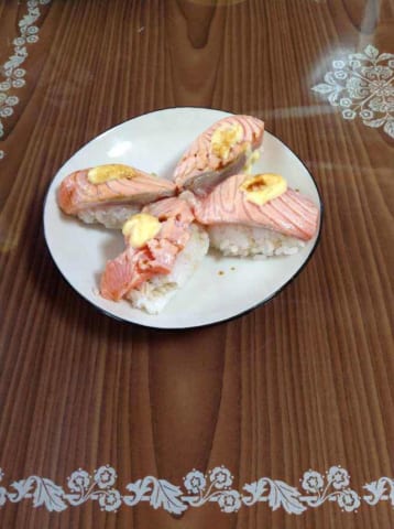 ほいよ。 炙っちまえば加熱用サーモンでもうんめぇ寿司に様変わりってわけ