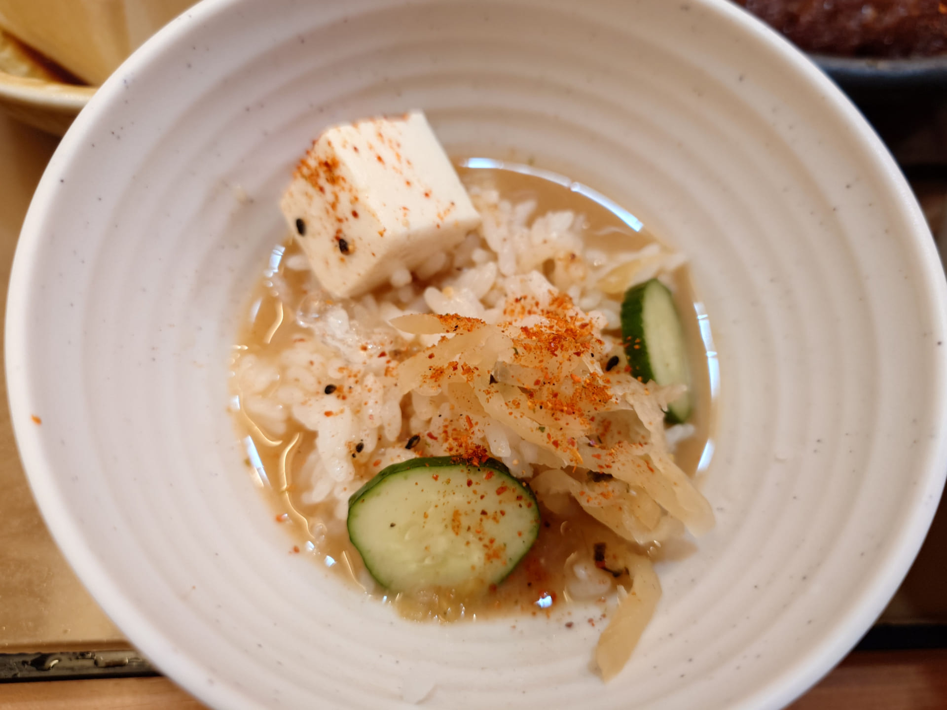 出汁茶漬けを冷たくして漬物とサバいれただけや