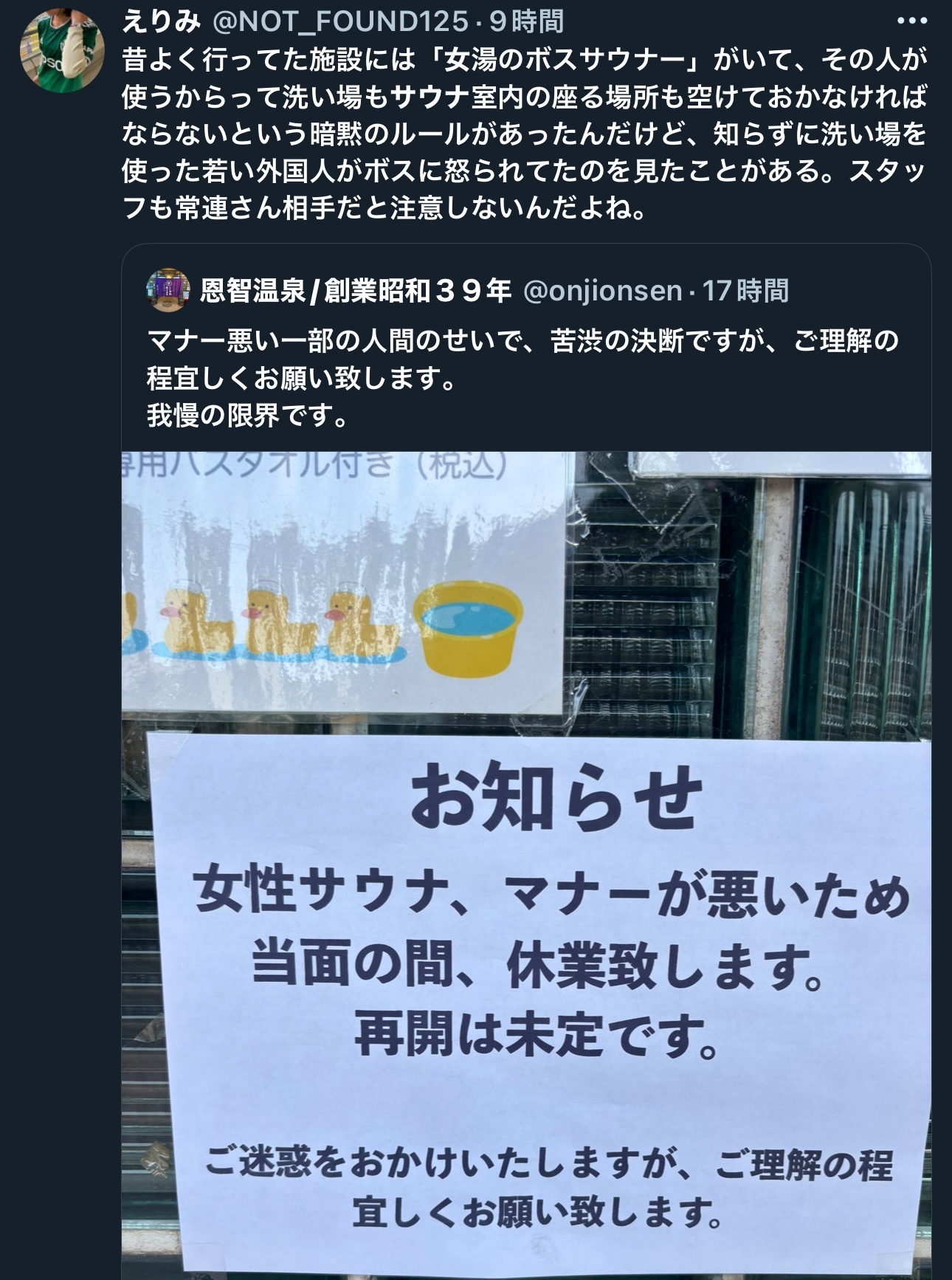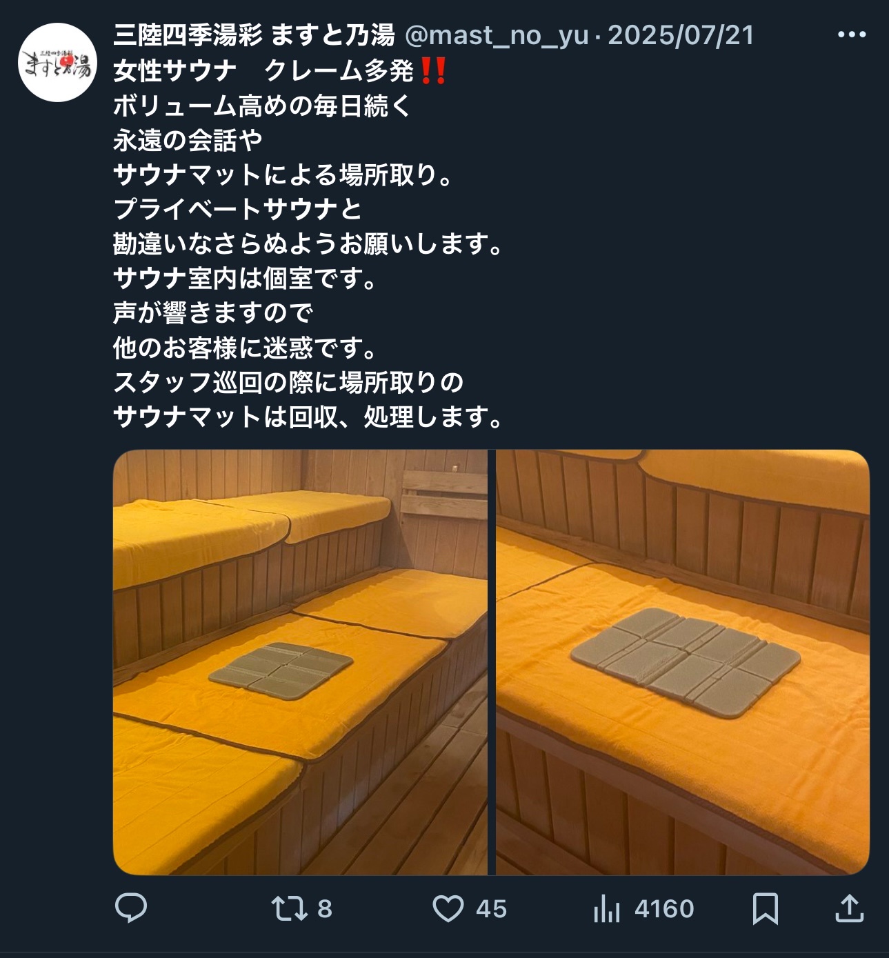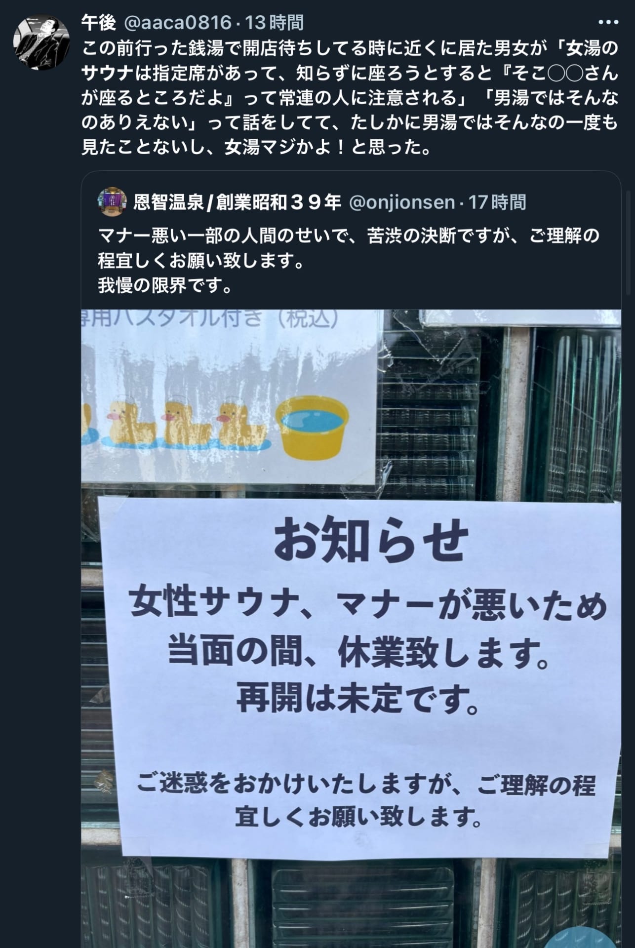 女子は美容医療やアートメイク系、プレートとか何かしら身体に入れてたりするからサウナNGてか行かない子多いと思うけど。。おばちゃんなのにマナー×とかキツいね