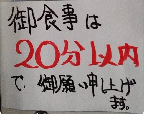 時間気にして食う店とか普通に嫌だな 仮に20分もかからかったとしても