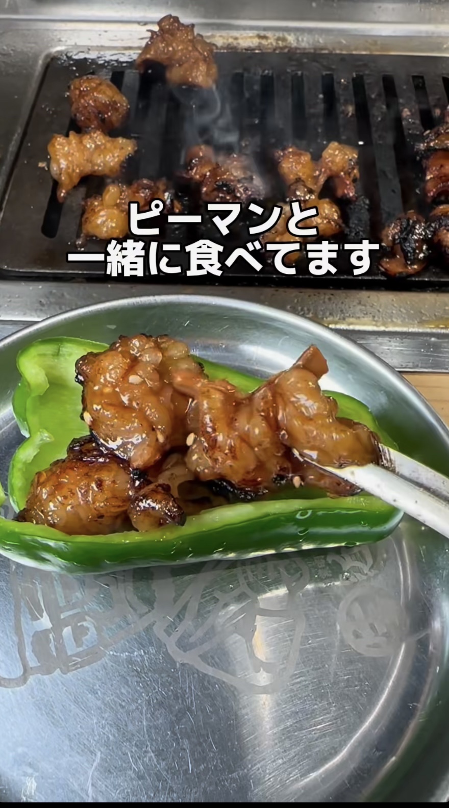 焼ホルモンを生ピーマンに乗っけるんや