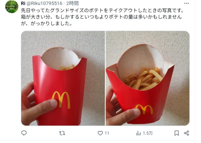 大昔ならともかく今は注文が入った時点で冷凍ポテトを規定量計量して揚げる 複数注文入った場合クルーの詰め方の問題で多少変化はあるがここまで少ないことはありえない
