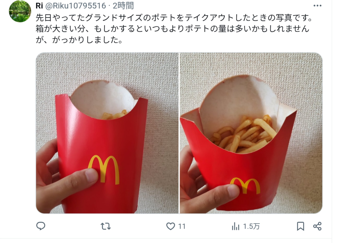 電話でクレームいれて直接店に持っていくとパンパンにしてくれるよな ワイが店内待ちしてる時に来たオラついとおっさんがMサイズの箱パンパンに詰まってるポテトゲットしてた