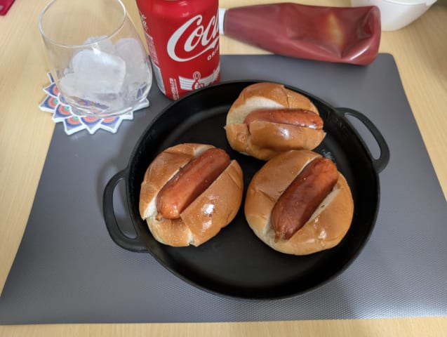 普通に棚にあるヤマザキかどっかのホットドック系のやつを丸めて口に入るように食うのがうまい