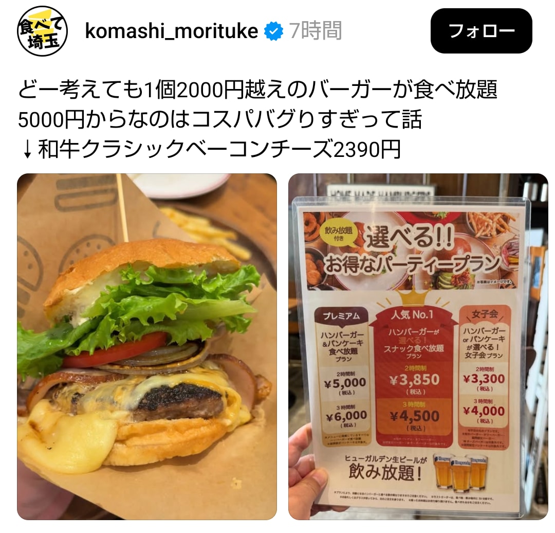 単品でバーガー1個、サイド2品、ビール3〜4杯で5000円前後払ったほうが圧倒的にコスパ良い
