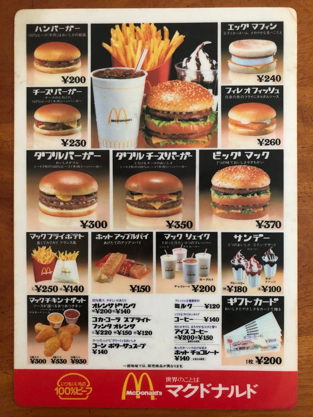 1980年代のマックのメニューの写真、昔はこんなに高かったという文脈で出されがちだけど、なんか今みると普通に安いな。笑🐸