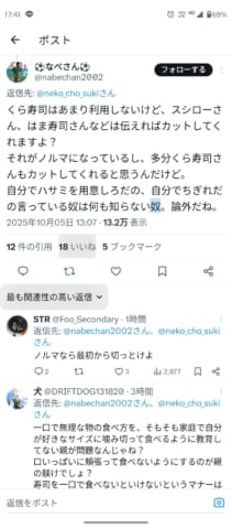 回転寿司なんてガキ来るんやから小さく切るやつ用意しとけとは思うが文句言うのは違うわな