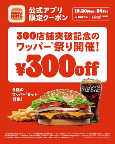 バーガーキング、祝・300店舗突破!300円引きになる「ワッパー祭り」実施