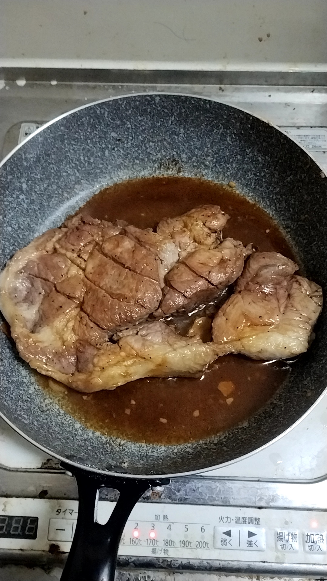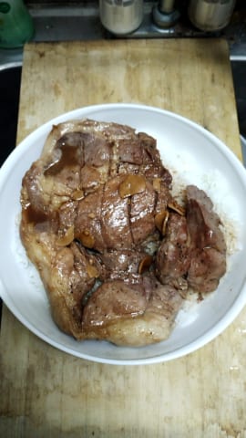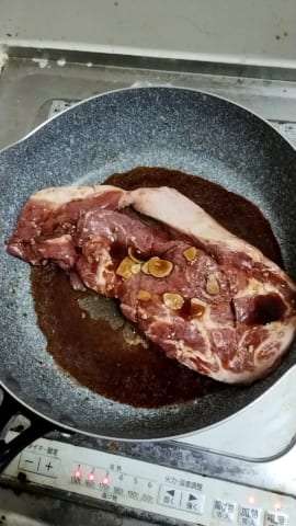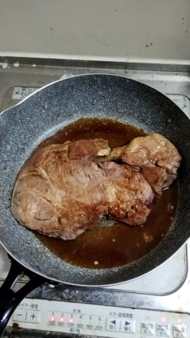 それから水か酒入れてフタして蒸し焼きで火を通して(温度計で内部温度計るの必須)、醤油とか調味料入れてソース作る。