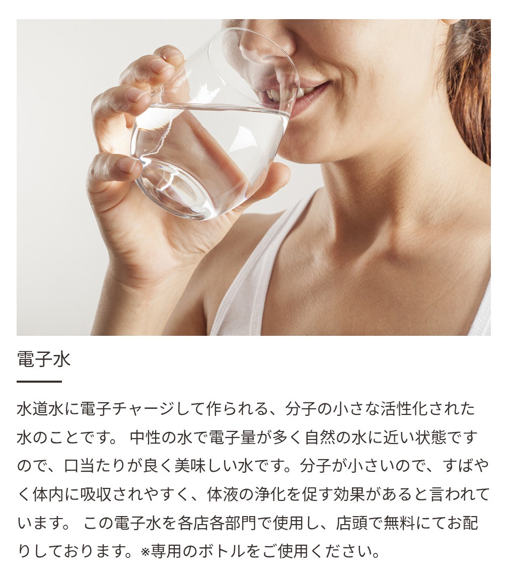 > 電子水を各店各部門で使用し、店頭で無料にてお配りしております。※専用のボトルをご使用ください。
