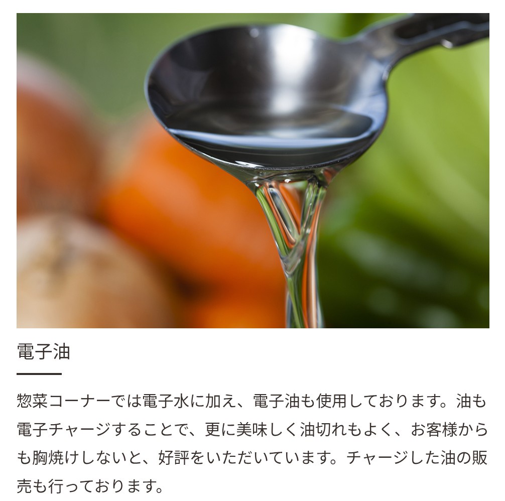 > 惣菜コーナーでは電子水に加え、電子油も使用しております。チャージした油の販売も行っております。