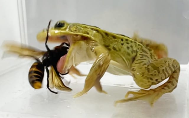 研究チームは45匹のトノサマガエルを3グループに分け、それぞれをキイロスズメバチとコガタスズメバチ、オオスズメバチと同じ空間に入れた。すると79~93%の高い確率でカエルがスズメバチを捕食した。