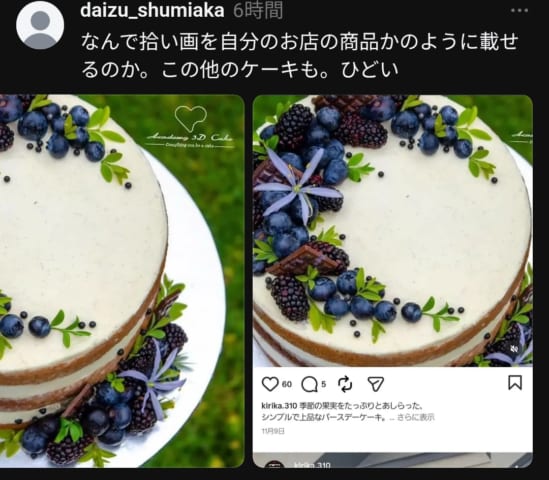 適当に拾ってきた写真を自分のとこのケーキとしてインスタに載せてるらしい