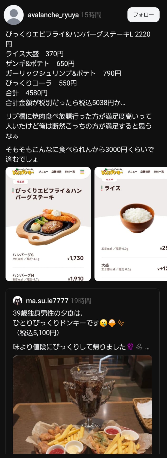 独身男性「びっくりドンキーで夕食したら味より値段にびっくりした💦(5100円)」