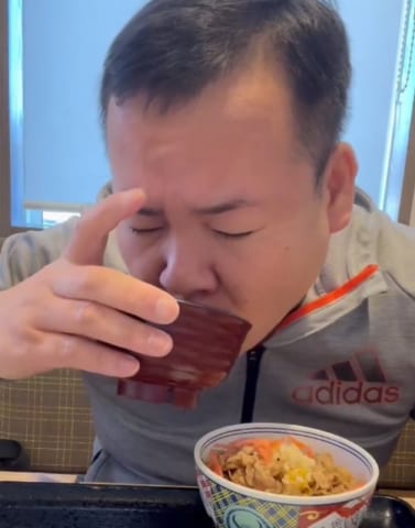 おっさんが牛丼食ってるだけ