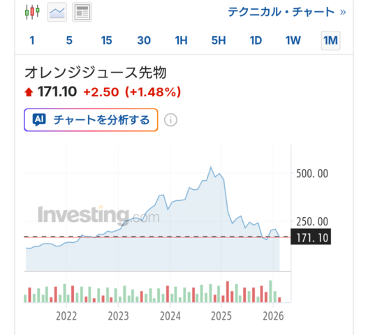 去年はオレンジジュースの市場価格が例年の三倍くらいに高騰した
