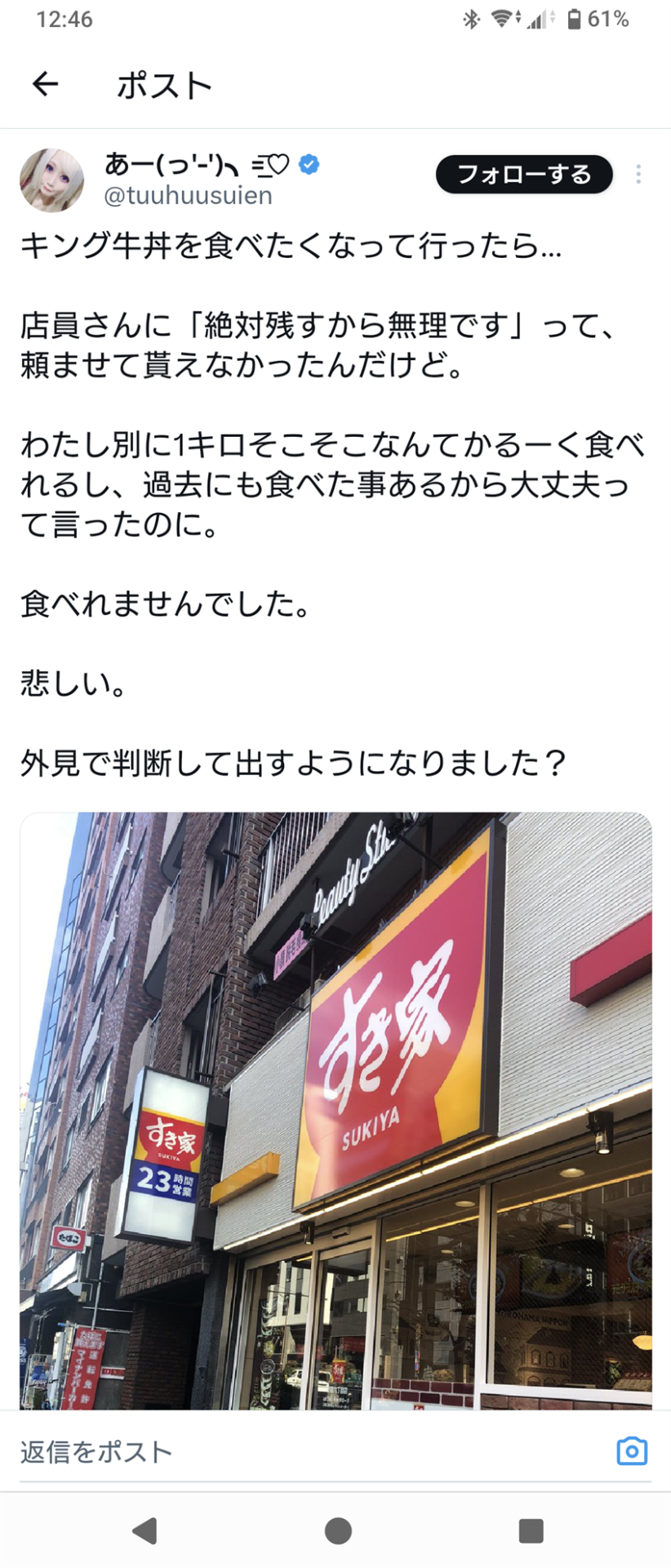 どう考えてもこの女さんの「アタシ見た目痩せてていかにもキング牛丼なんて食べなさそうですよ」アピールやろ