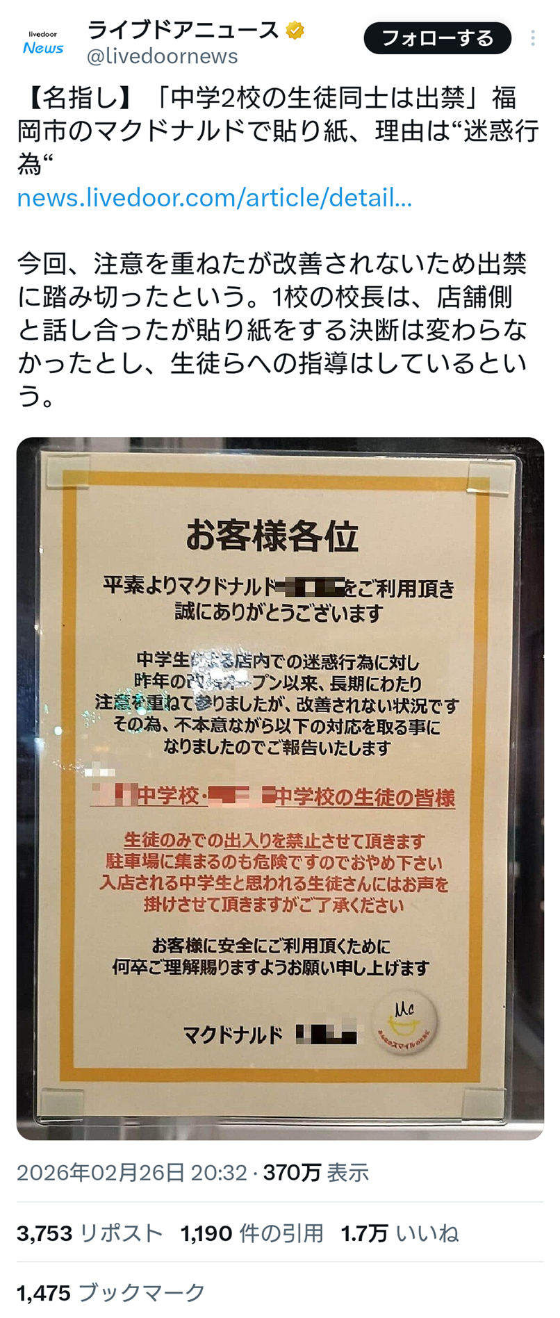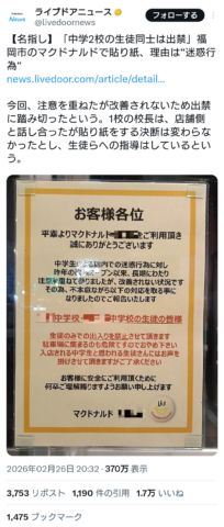 基本的に中高生がたむろするとロクなことないから全ての店で保護者同伴以外は出禁でいいやろ