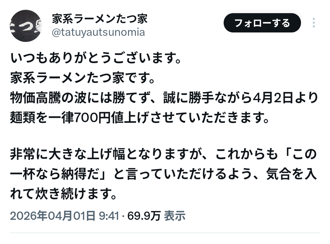 950円のラーメンを700円値上げって言うほどあり得るんか?