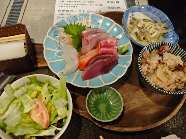 刺身に生野菜のサラダでちぐはぐな感じは否めないが、¥950は妥当だと思う。