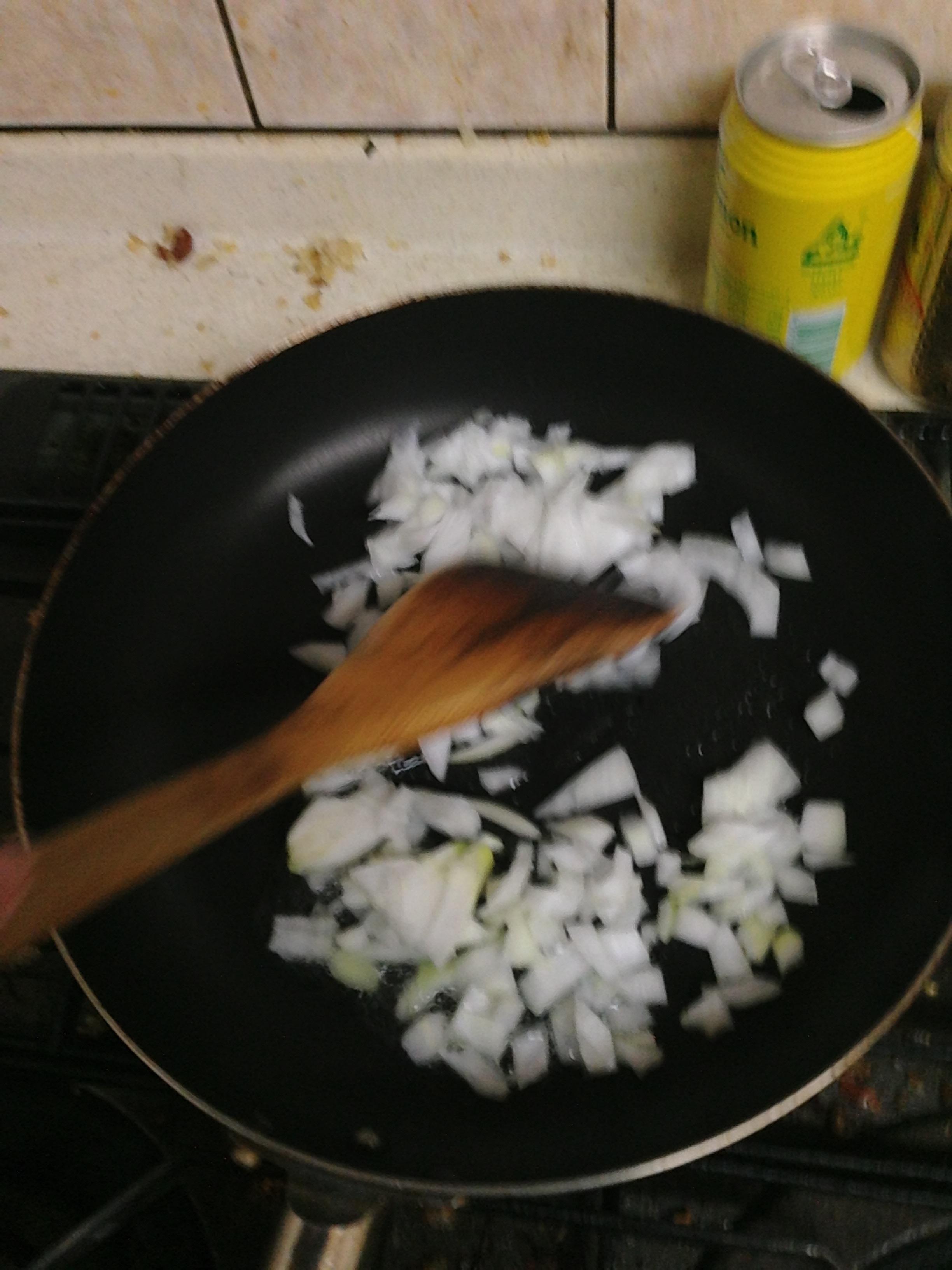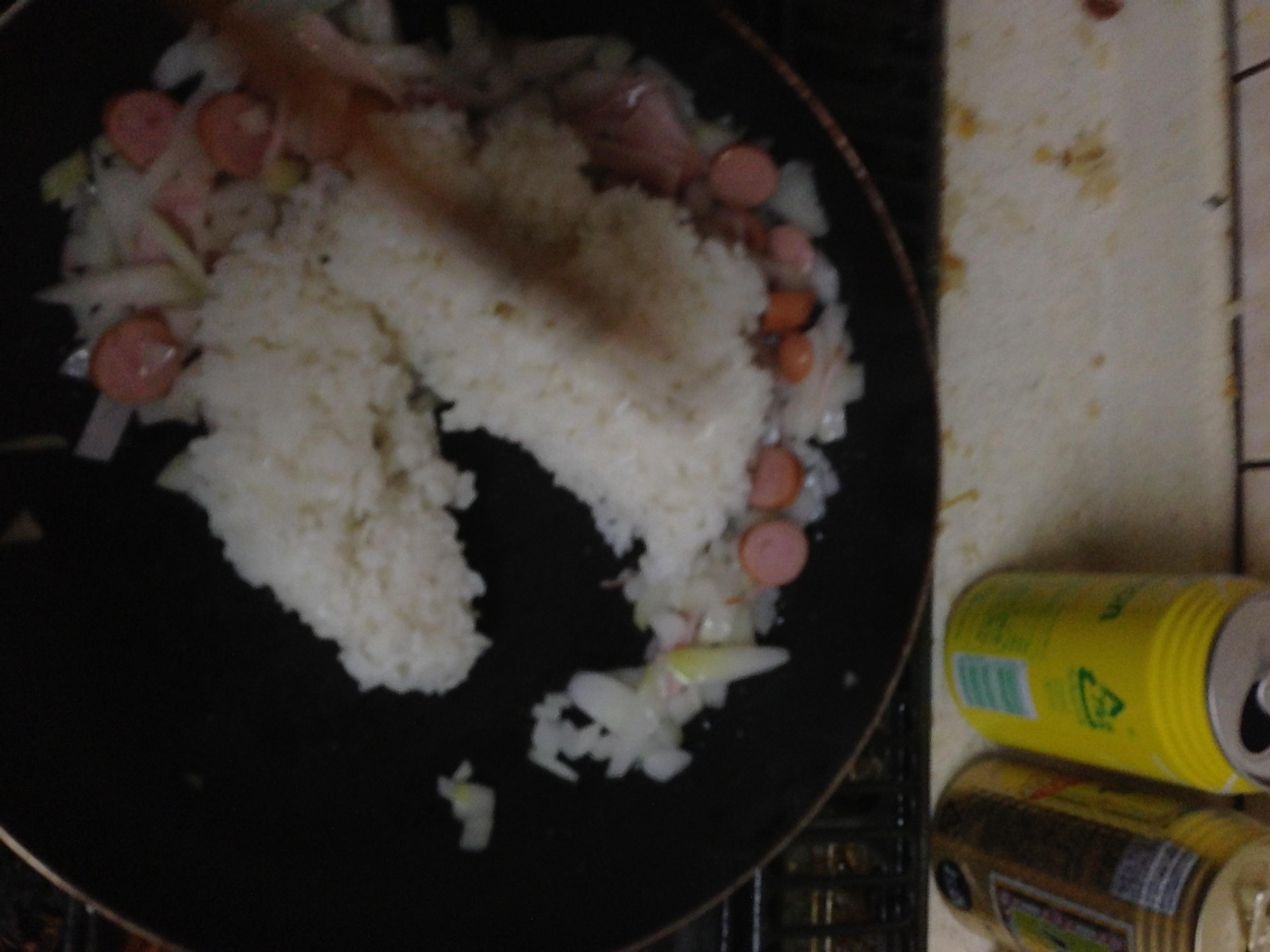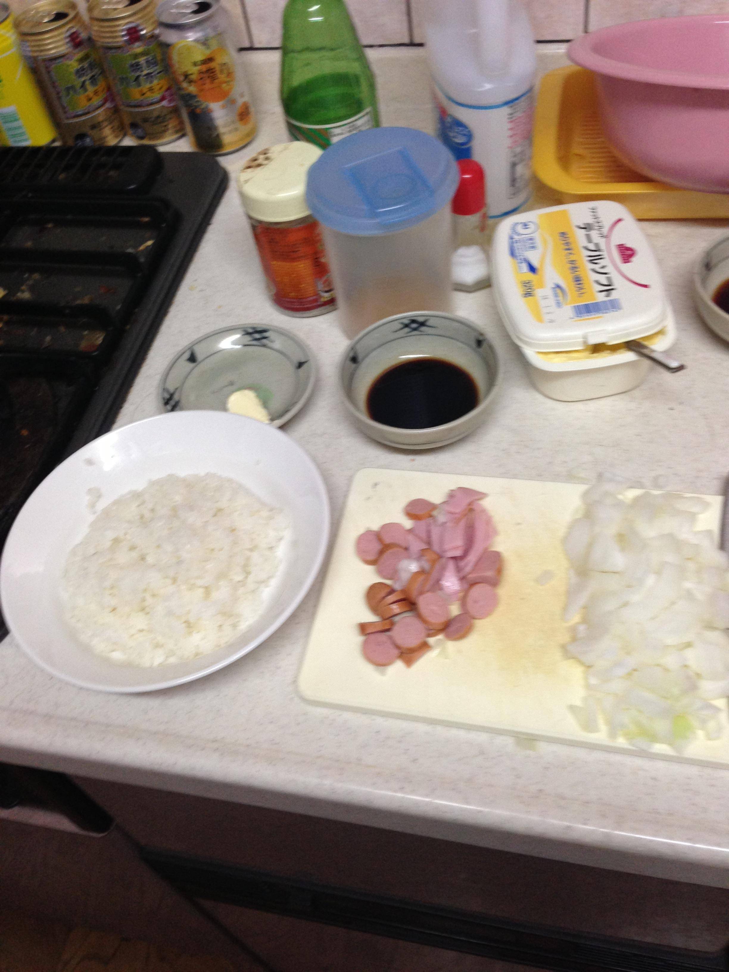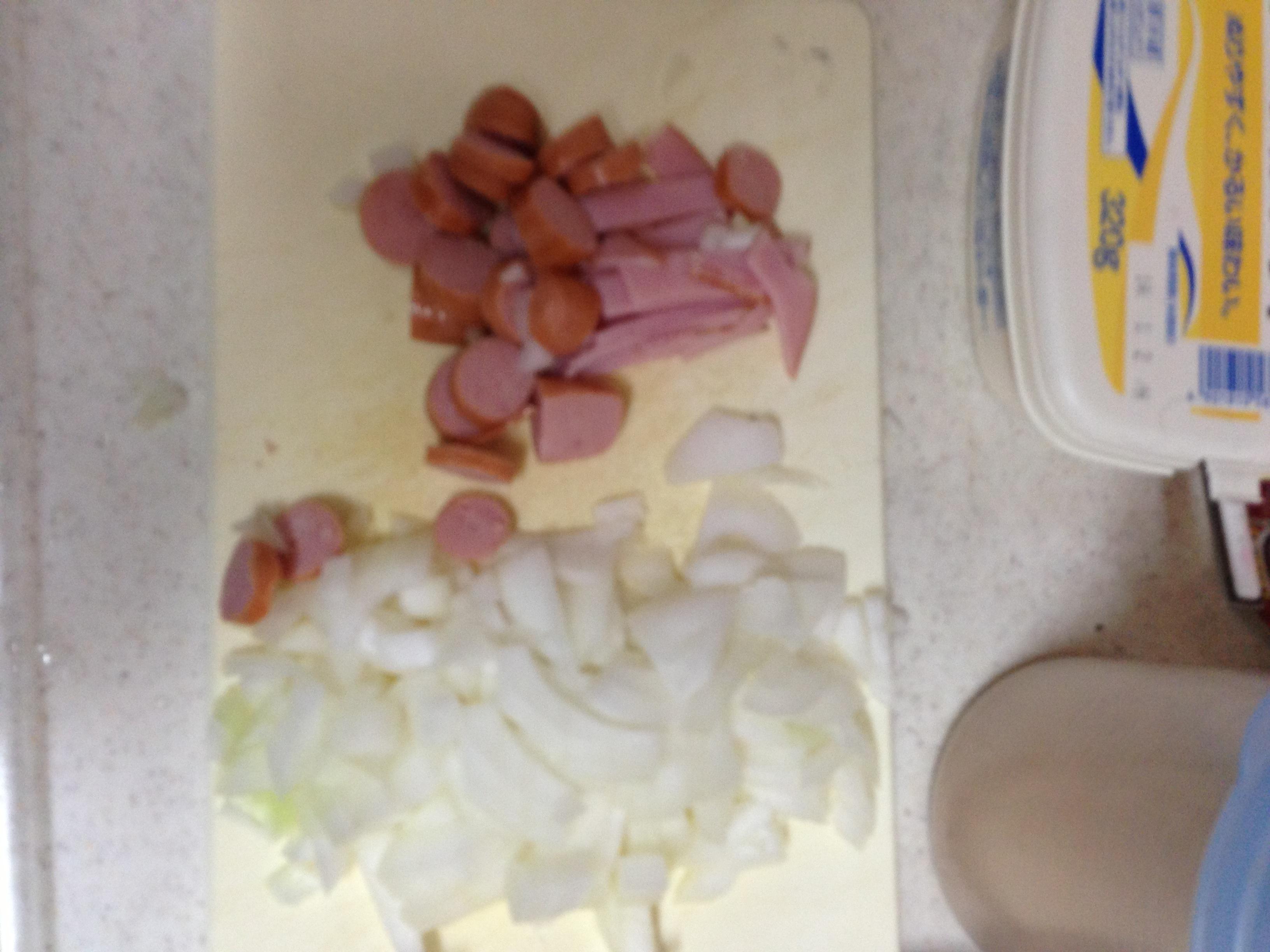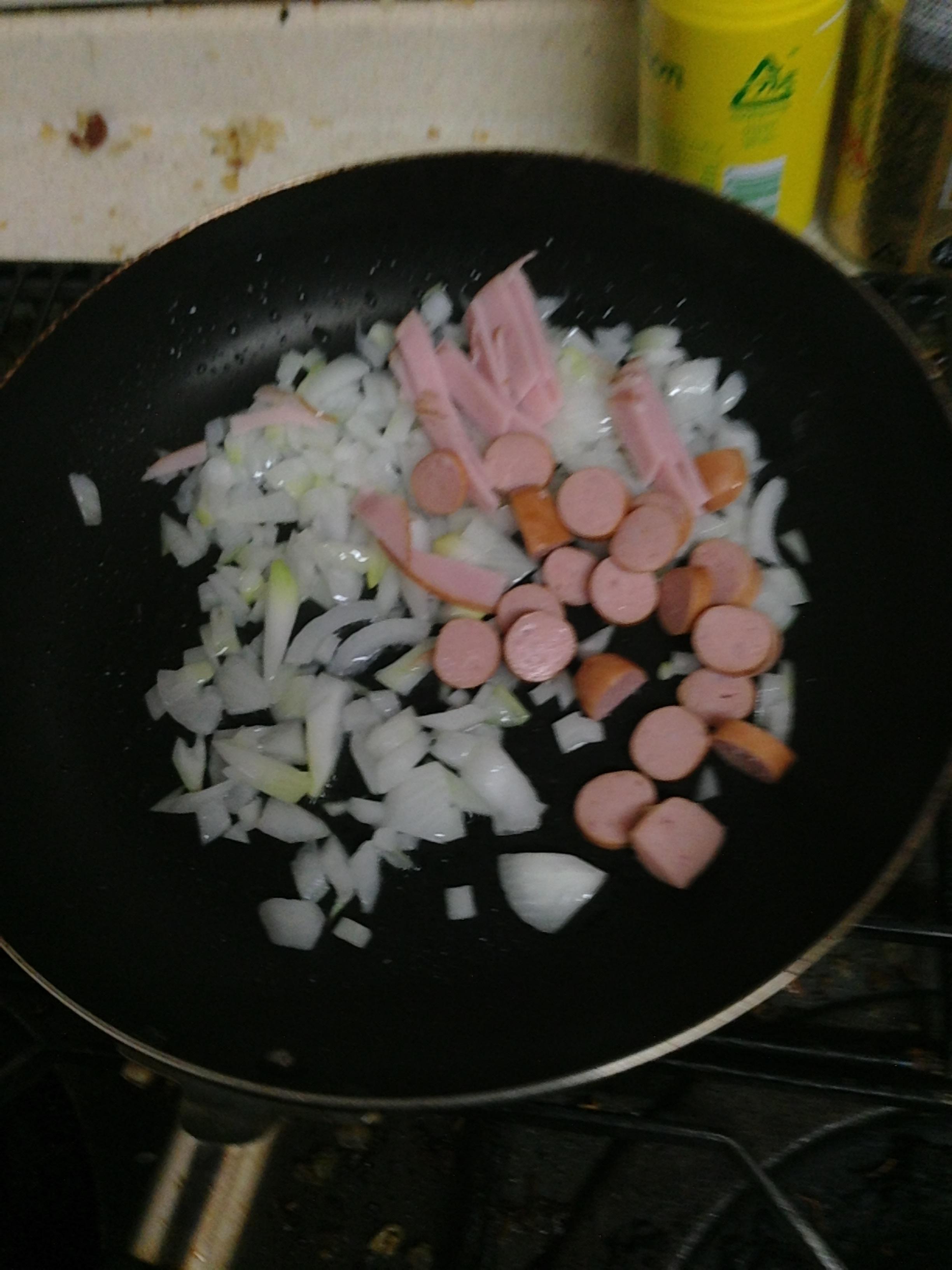 玉ねぎがしんなりしてきたらハムとウインナー投下!