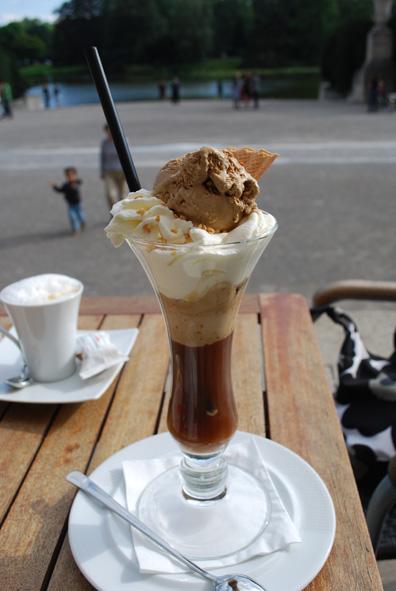 下にはなじみある液体が見えます。その上にアイスクリームがあり、生クリームがあり、またアイスクリーム。ナッツのかけらやチョコチップも見えます。