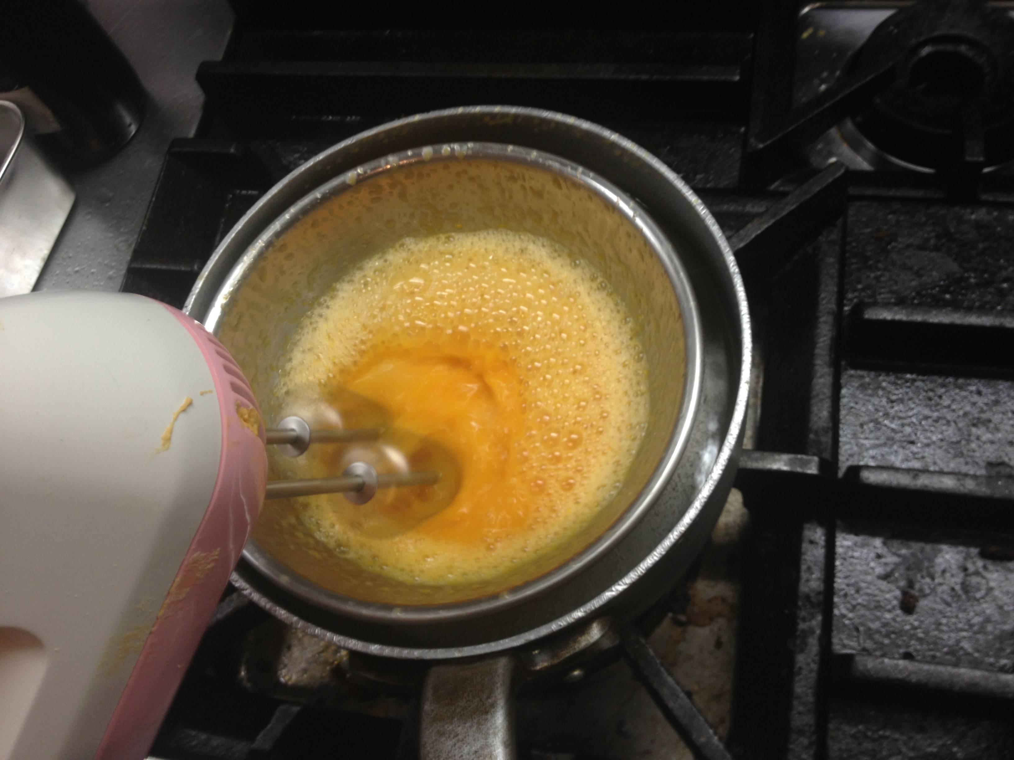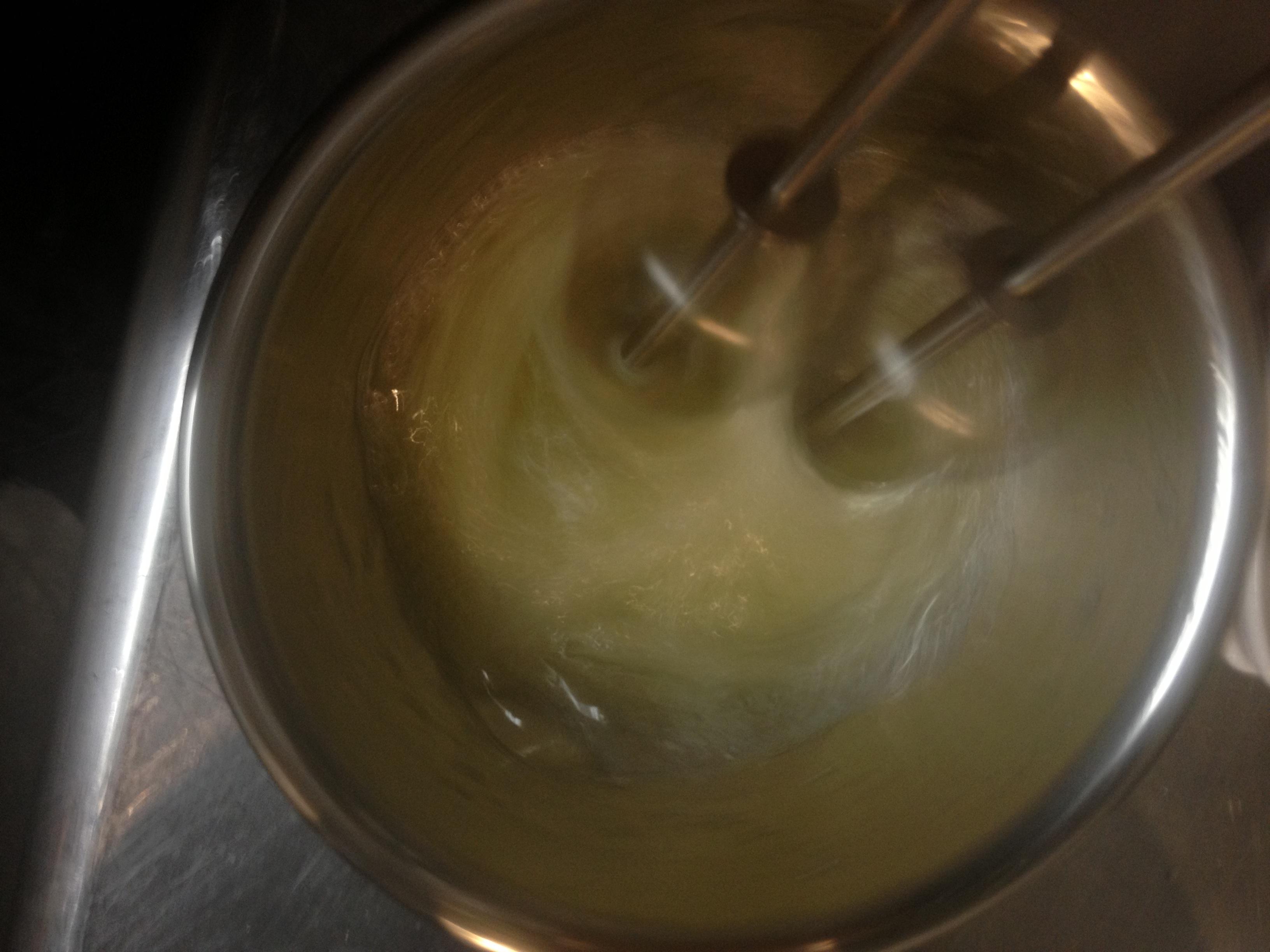 湯煎にかけながら泡立て器でもあもあになるまであわ立てるよー