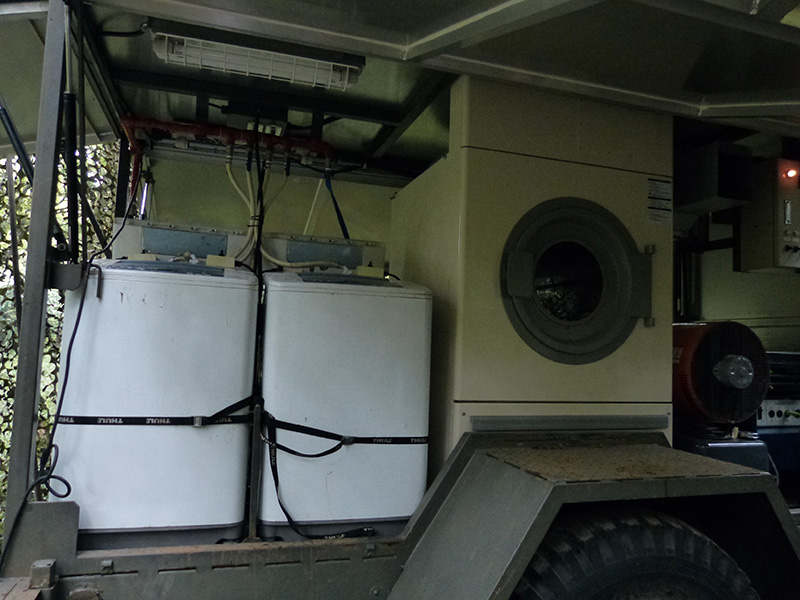 >「野外洗濯セット2型」。トレーラーに洗濯機と乾燥機を設置したもの。トレーラーの側面を開けると、それが屋根代わりになる