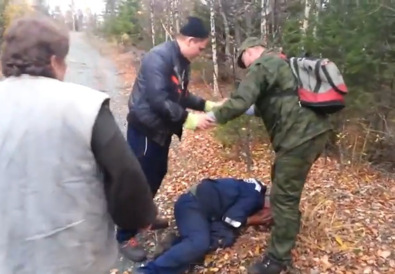察するに、迷彩の男がふざけて食わせてアヒャったから