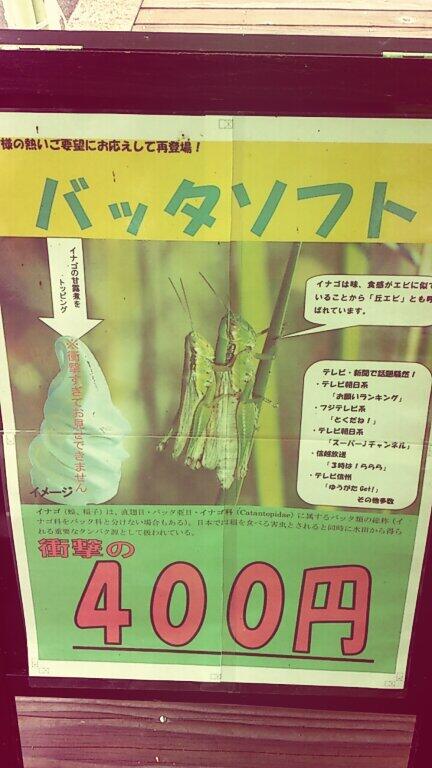 長野やばい。バッタソフトって頭おかしい。ソフトクリームにバッタ混ぜ込むって発想が理解できない。 https://twitter.com/SIno1120/status/386311657846104065
