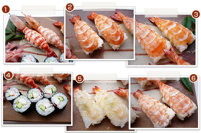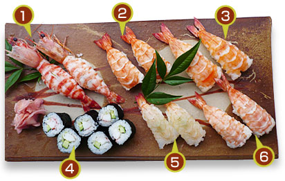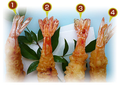 上:ブラックタイガー 下:車海老 1.車えび 2.ブラックタイガーえび 3.メキシコブラウンえび 4.シータイガーえび(有頭) 5.エンデバーえび 6.フラワーえび 1.フラワーえび 2.ブラックタイガーえび 3.車えび 4.ホワイトえび ホワイトえびは、他の3種と比べて尻尾が細長いという特徴があります。 だってよ。