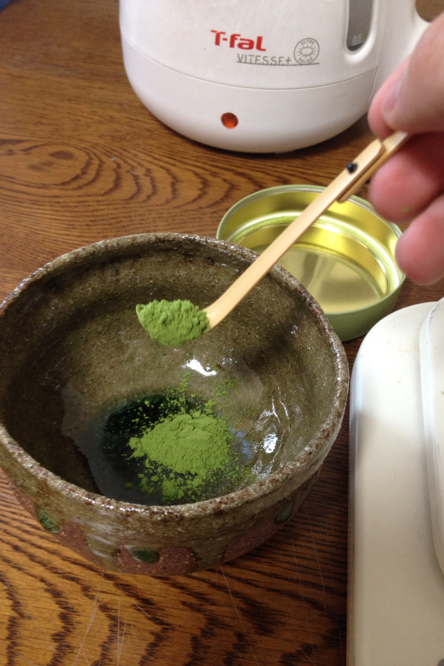 まずは抹茶を先に茶碗に入れてね