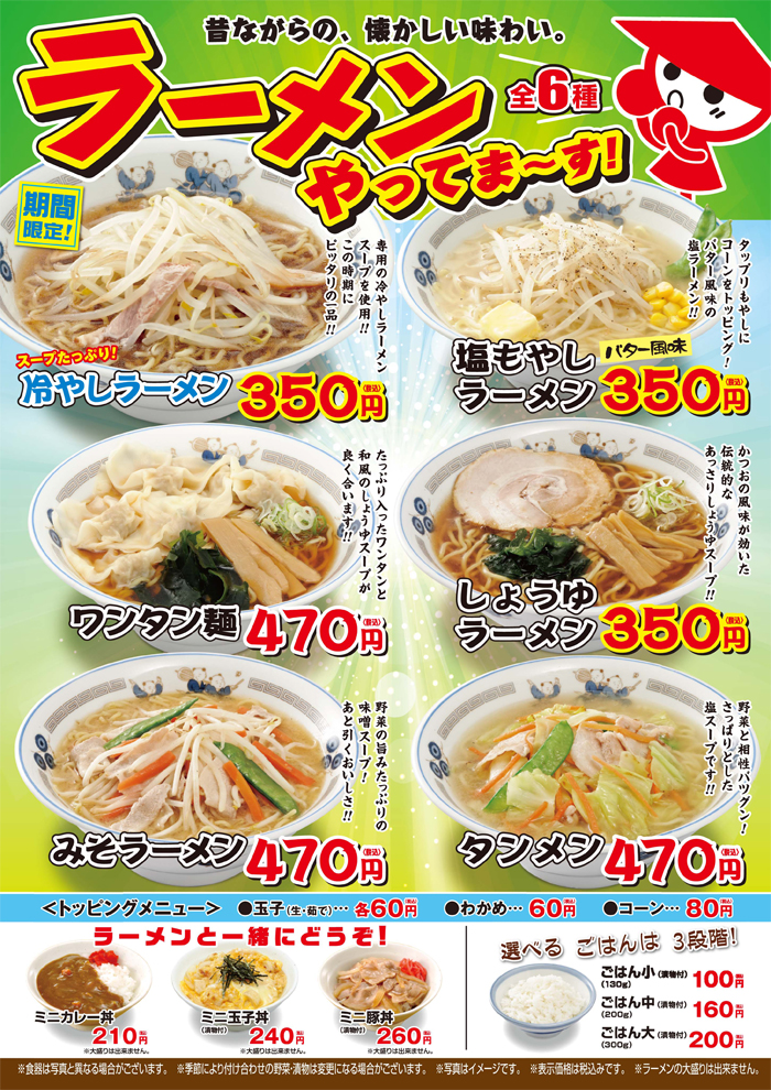 ※味噌ラーメン・タンメンは単品のみの販売となります。