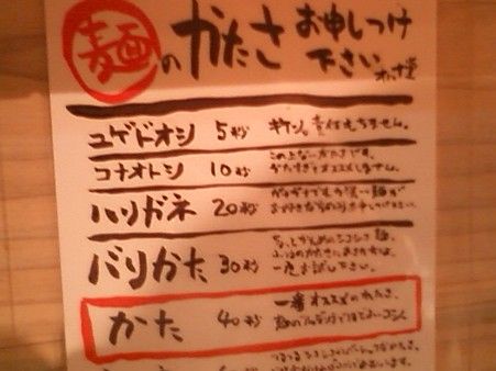 同じ世代以上で生固より上の固さで頼む人は、大抵せっかちか急いどって味より出てくるスピード重視か、何度かたべてその固さで慣れてしまった人ばっかやね。