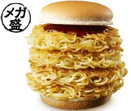 【画像あり】ロッテリア「つけ麺バーガー」にメガ盛が登場 怒涛の4段重ね!!