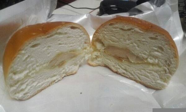 これ挟んでないだろ。パン生地に肉入れて焼いてる。鶏肉パンだな。