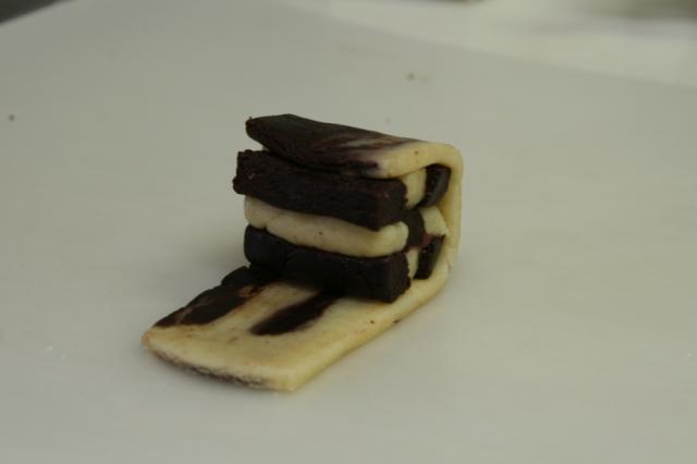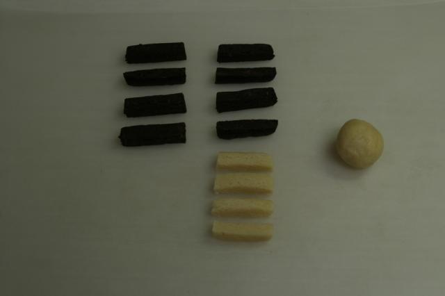 黒い生地と白い生地の半分を1.5cm角の棒状にするよ
