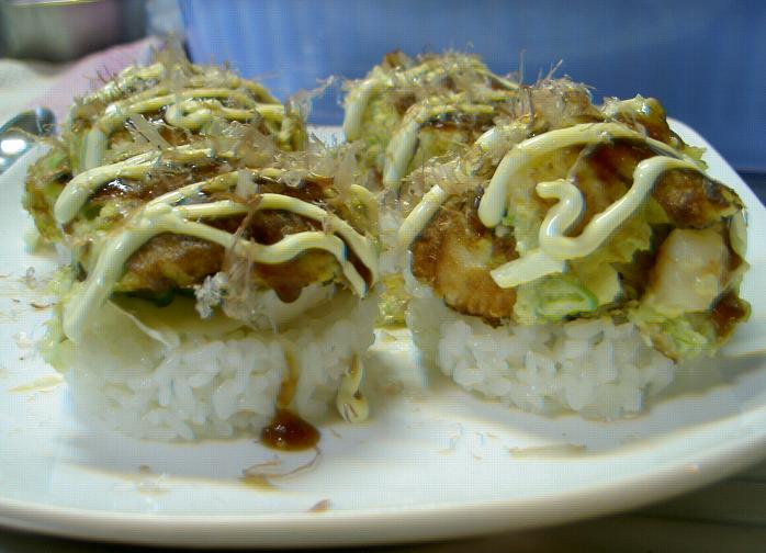 ご飯は知らないけど、モチ入りのお好み焼きがあって