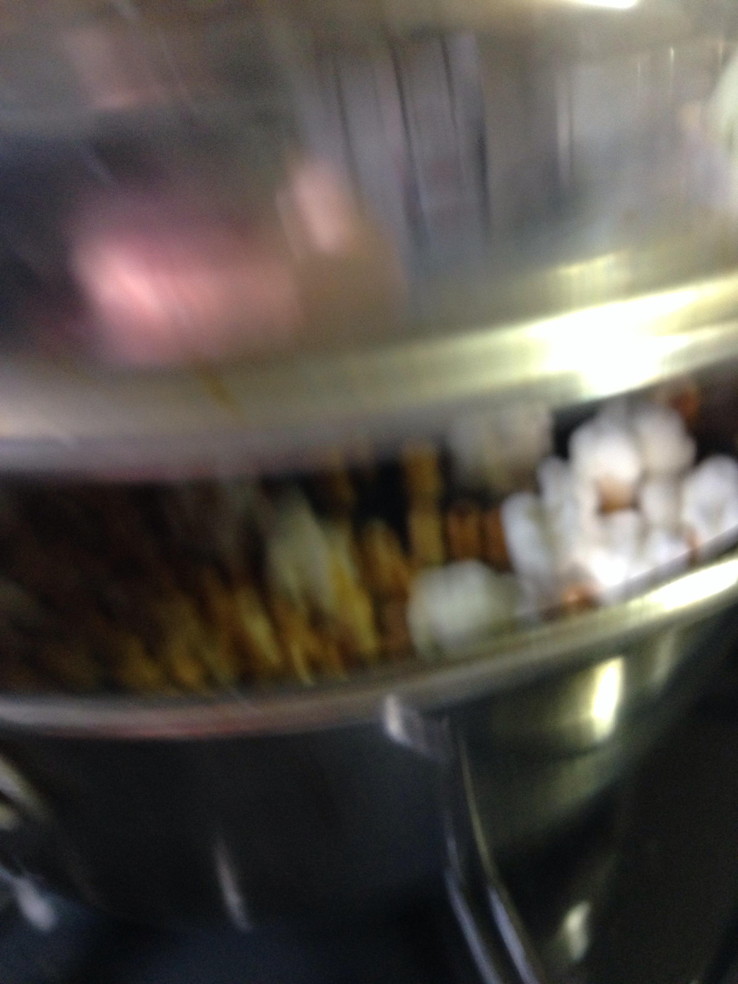 中火でいいと思う 焦げないように鍋を振りながら 少し経つとポンポンいってくるから、振り続ける
