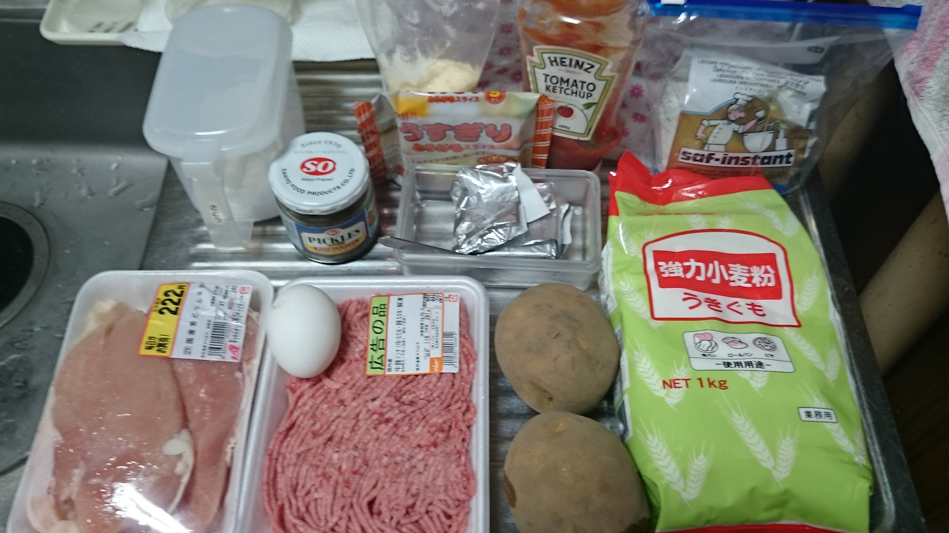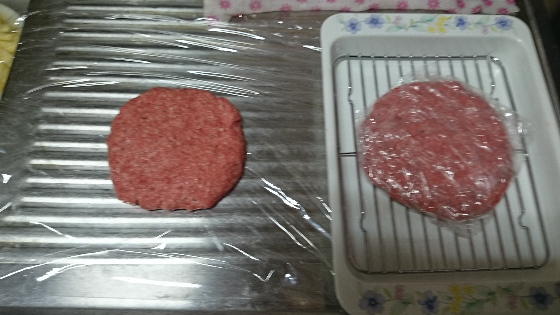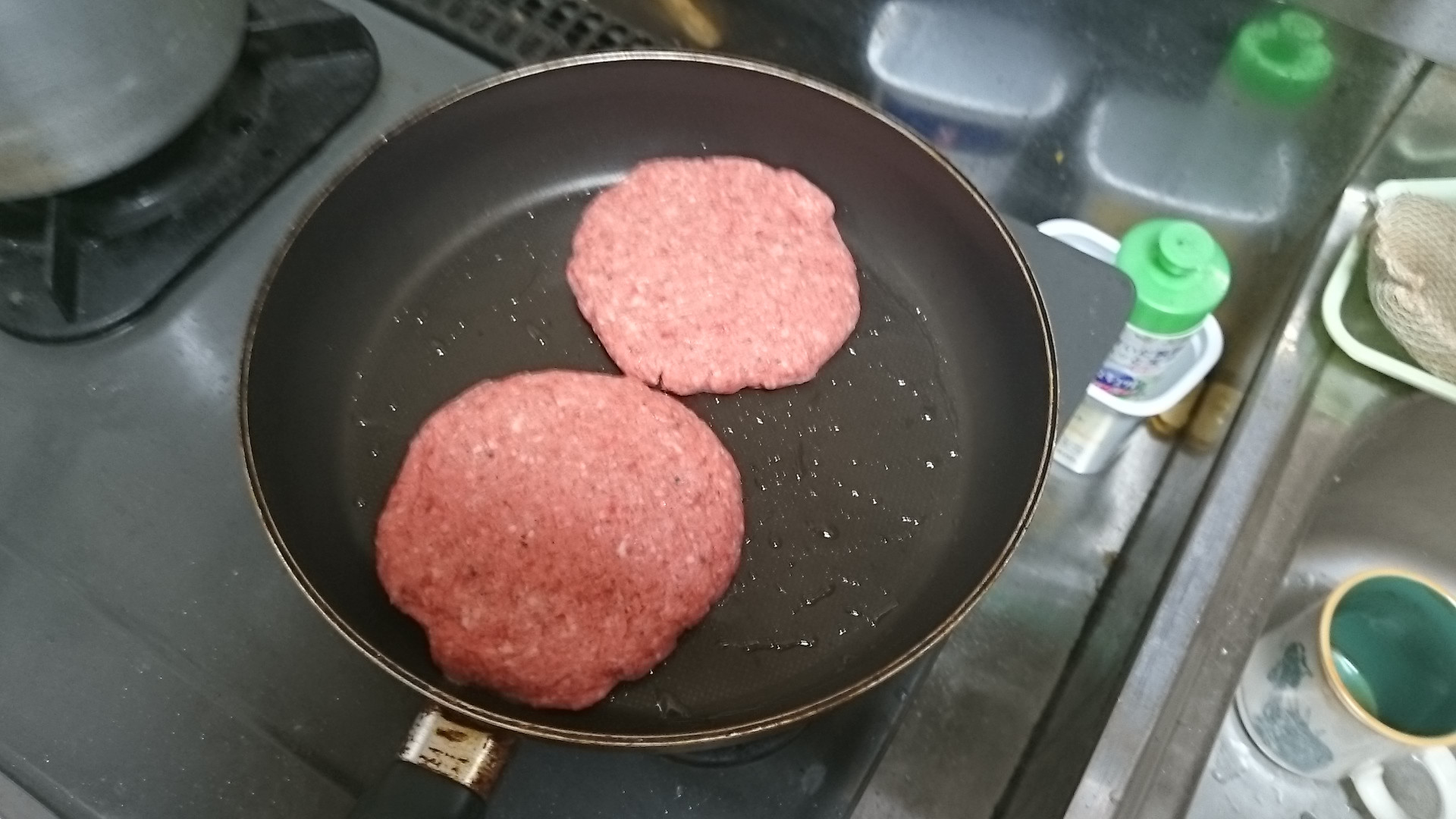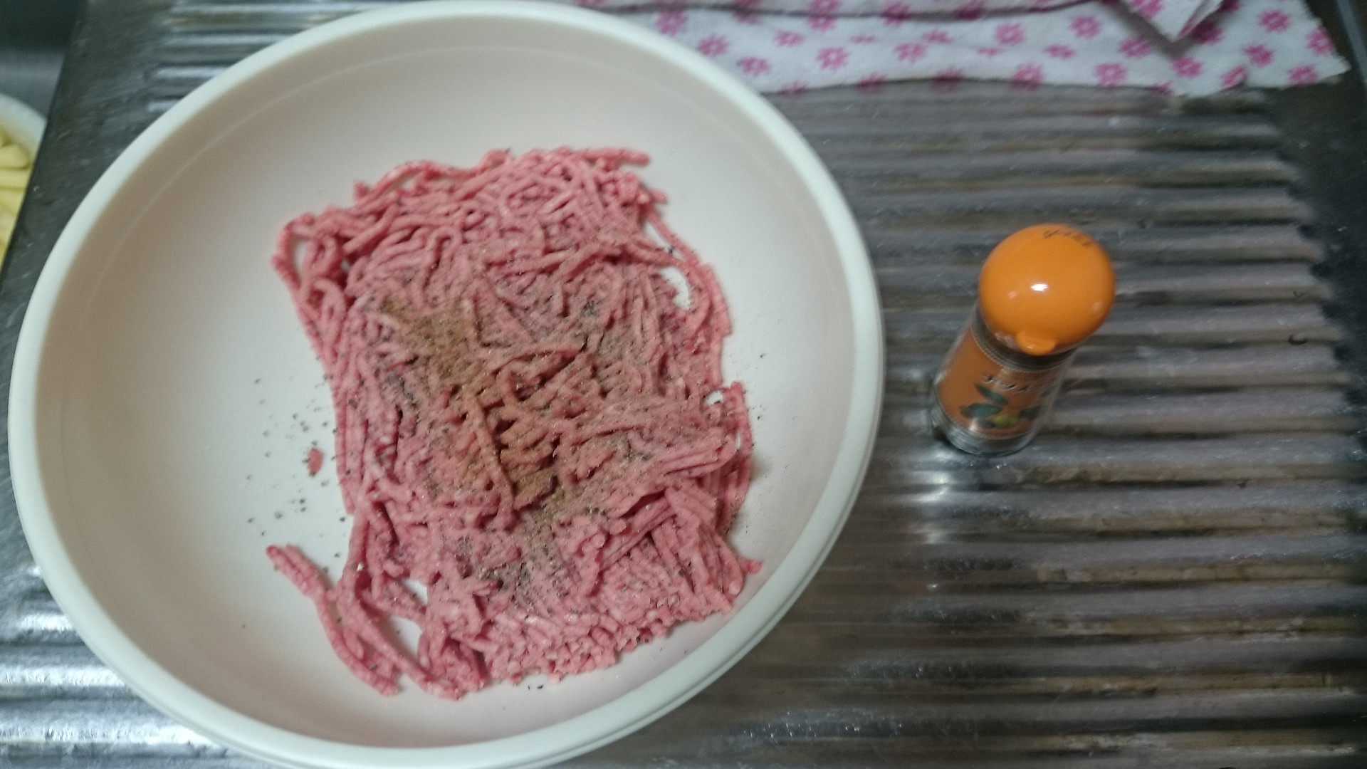 次にバーガーのパティの下処理するよ 牛豚ひき肉に塩コショウして卵1個投入してコネコネ 牛100%のひき肉が近くのスーパーに売ってなかったの! 需要少ないのかな?(´・ω・`)
