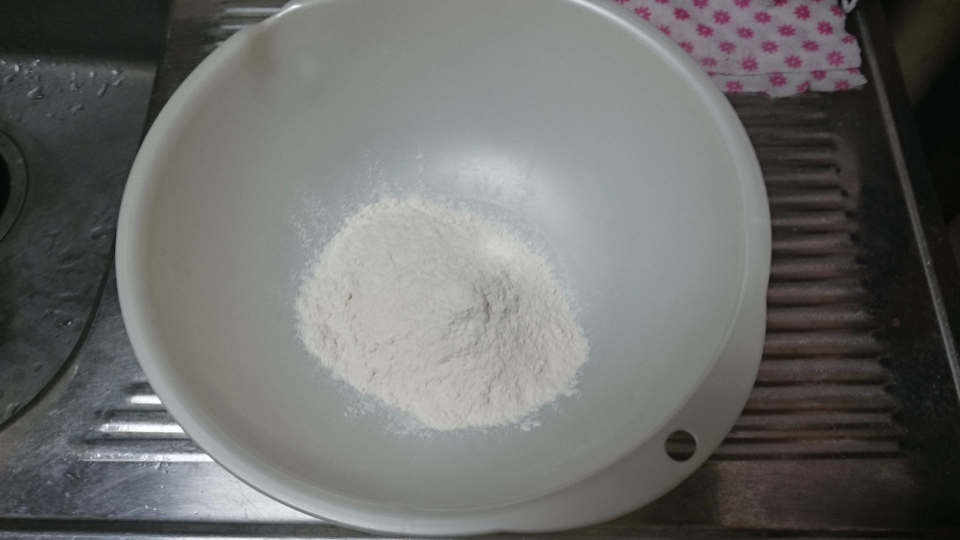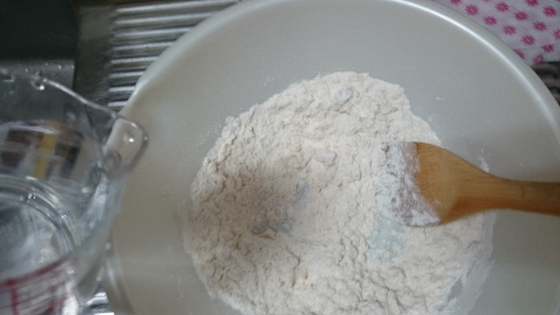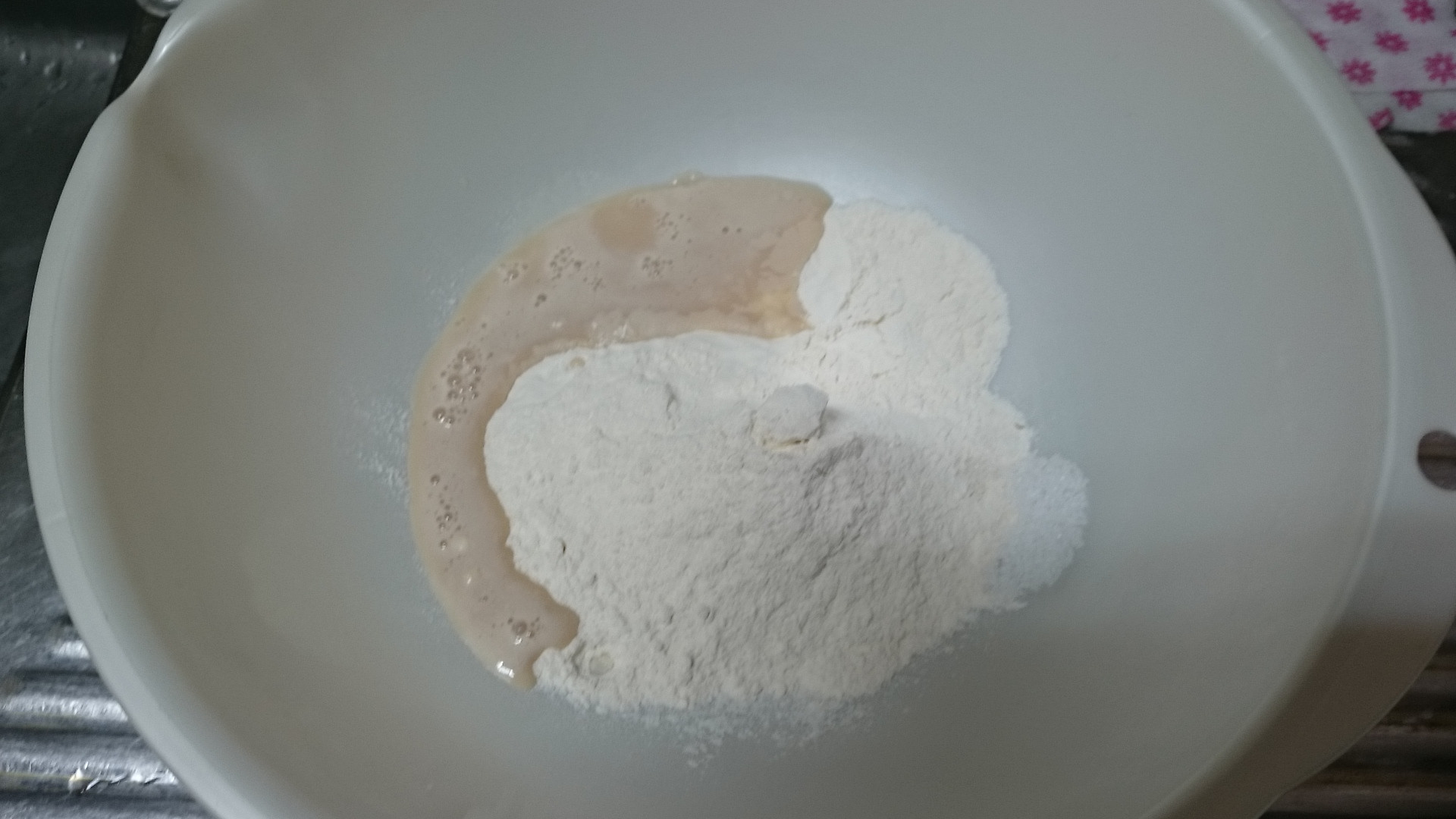 イースト液に使った水の分量を差し引いて追加のぬるま湯投入 硬さを見ながら少しずつ混ぜないと追加で小麦粉が必要になるよ