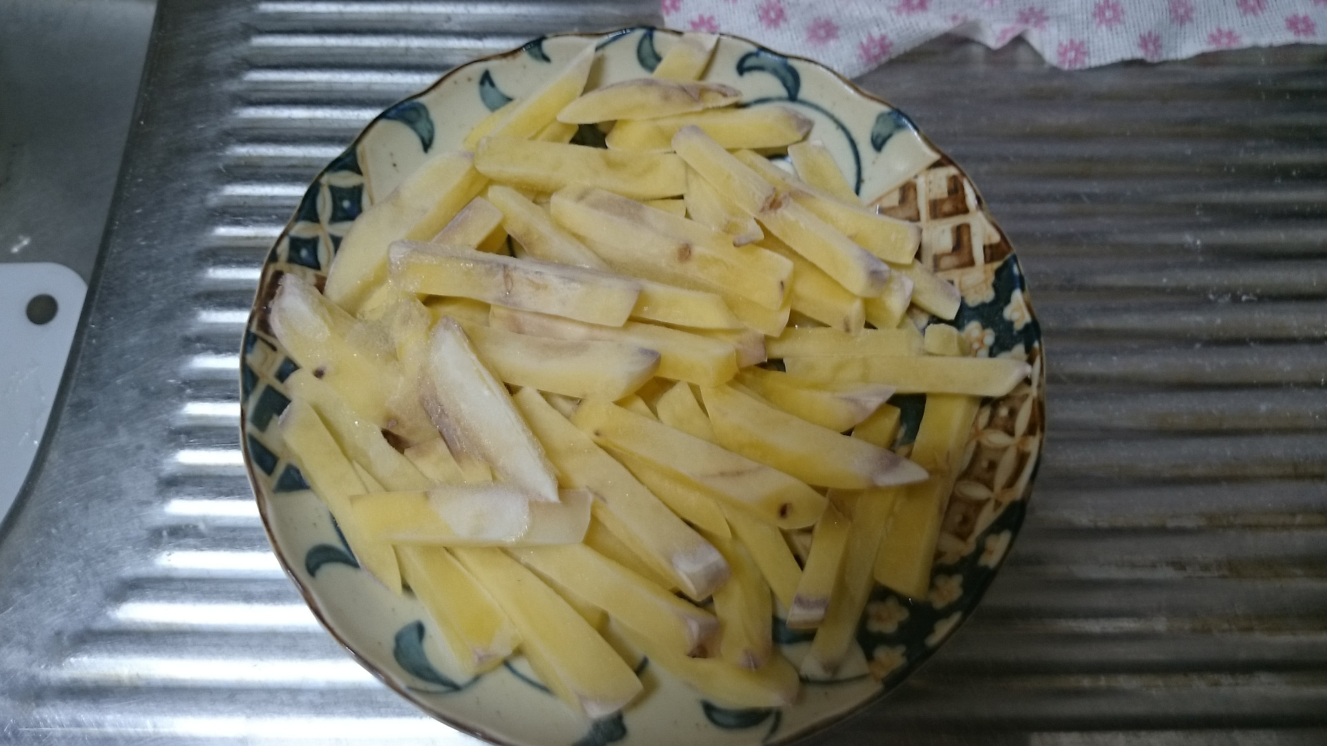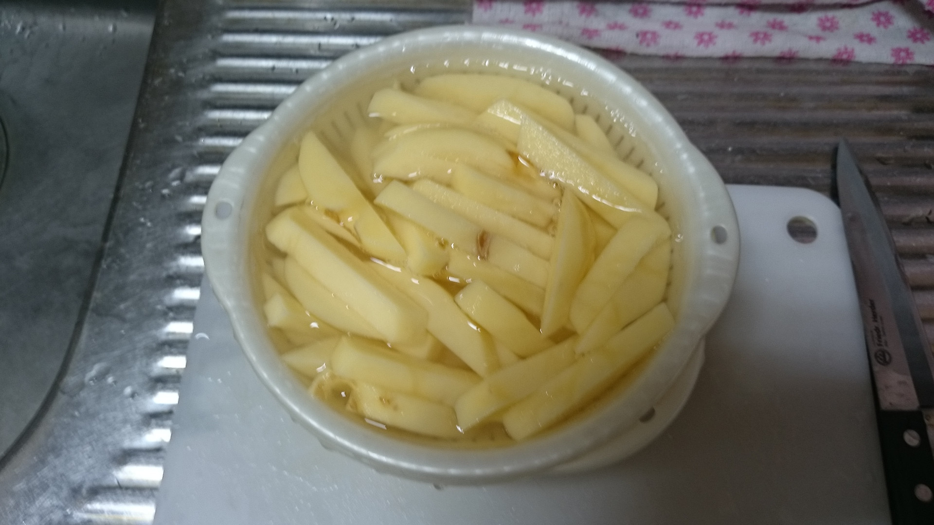 マックのポテトといえば細くてカリッとしているのが売りですが 扱いが難しいので今回のはKFCっぽい感じの少し太めポテトだよ 食べやすい大きさに切って水に晒しておきます