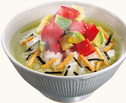 トマトとアボカドをオリーブオイルであえたものにお湯を注ぐ「トマトとアボカドのサラダ茶づけ」。あっさりしてヘルシーだと、